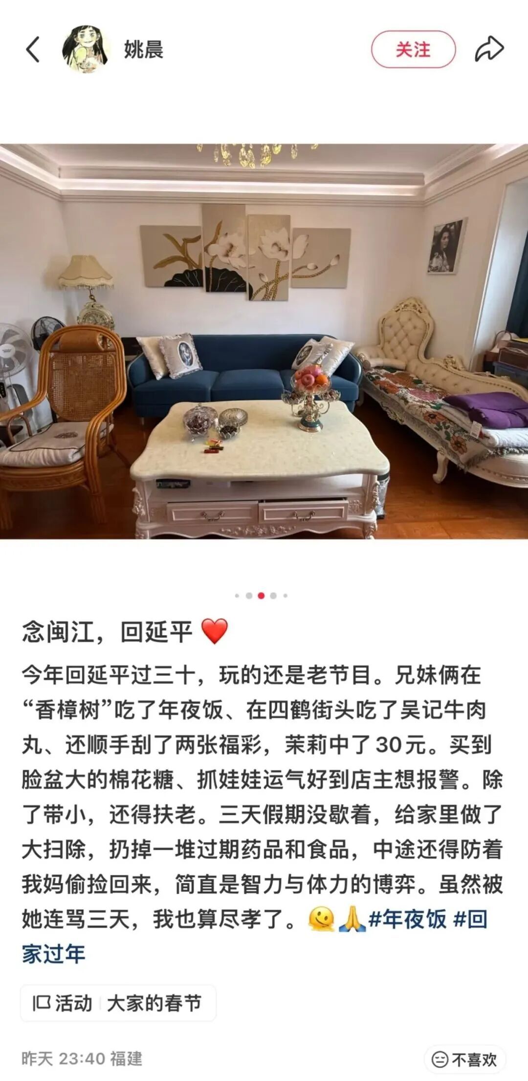 2月20日,演员姚晨发文:“今年回延平过三十,玩的还是老节目,兄妹俩在‘香樟树’吃了年夜饭。还顺手刮了两张福彩,茉莉中了30元,买到脸盆大的棉花糖,抓娃娃运气好到店主想报警。除了带小,还得扶老,三天假期没歇着,给家里做了大扫除,扔掉一堆过期药品和食品,中途还得防着我妈偷捡回来,虽然被她连骂三天,我也算尽孝了。”